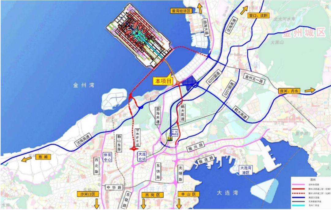 大连金州湾国际机场是为打造东北亚国际航空枢纽、服务环渤海经济圈与日韩俄贸易通道而建造的离岸人工岛机场,也是世界较大的离岸式“人工岛”机场,总投资约2630亿元,被列入国家“十四五”的重大交通工程。跨海大桥项目位于大连市甘井子区与金州区交界处,为大连新机场中线主通道跨海段,是大连新机场对外联系的主要通道。