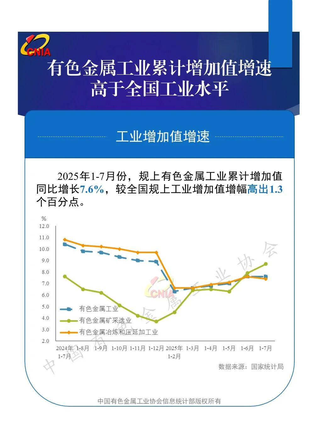 分行业看,7月份,有色金属矿采选业工业增加值同比实际增长13.2%,有色金属冶炼和压延加工业增长6.8%;1—7月份,有色金属矿采选业增长8.7%,增幅比上半年扩大0.8个百分点,有色金属冶炼和压延加工业增长7.4%,增幅比上半年收窄0.2个百分点。