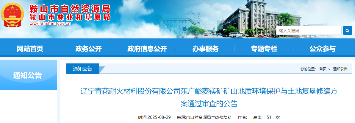 根据《国土资源部办公厅关于做好矿山地质环境保护与土地复垦方案编报有关工作的通知》(国土资规〔2016〕21号)、《辽宁省自然资源厅关于印发<矿山地质环境保护与土地复垦方案省级审查管理办法(试行)>的通知》(辽自然资发〔2022〕129号)有关要求,《辽宁青花耐火材料股份有限公司东广峪菱镁矿矿山地质环境保护与土地复垦修编方案》通过审查,现予公告。