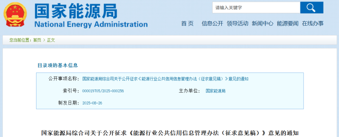 9月2日,国家能源局发布《能源行业公共信用信息管理办法(征求意见稿)》。