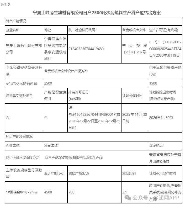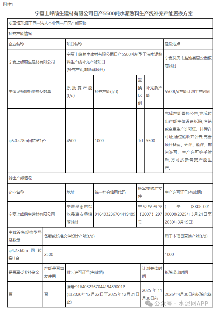 9月3日,宁夏工业厅发布“关于宁夏上峰萌生建材有限公司水泥熟料生产线补足产能置换和产能转出方案的公示”。