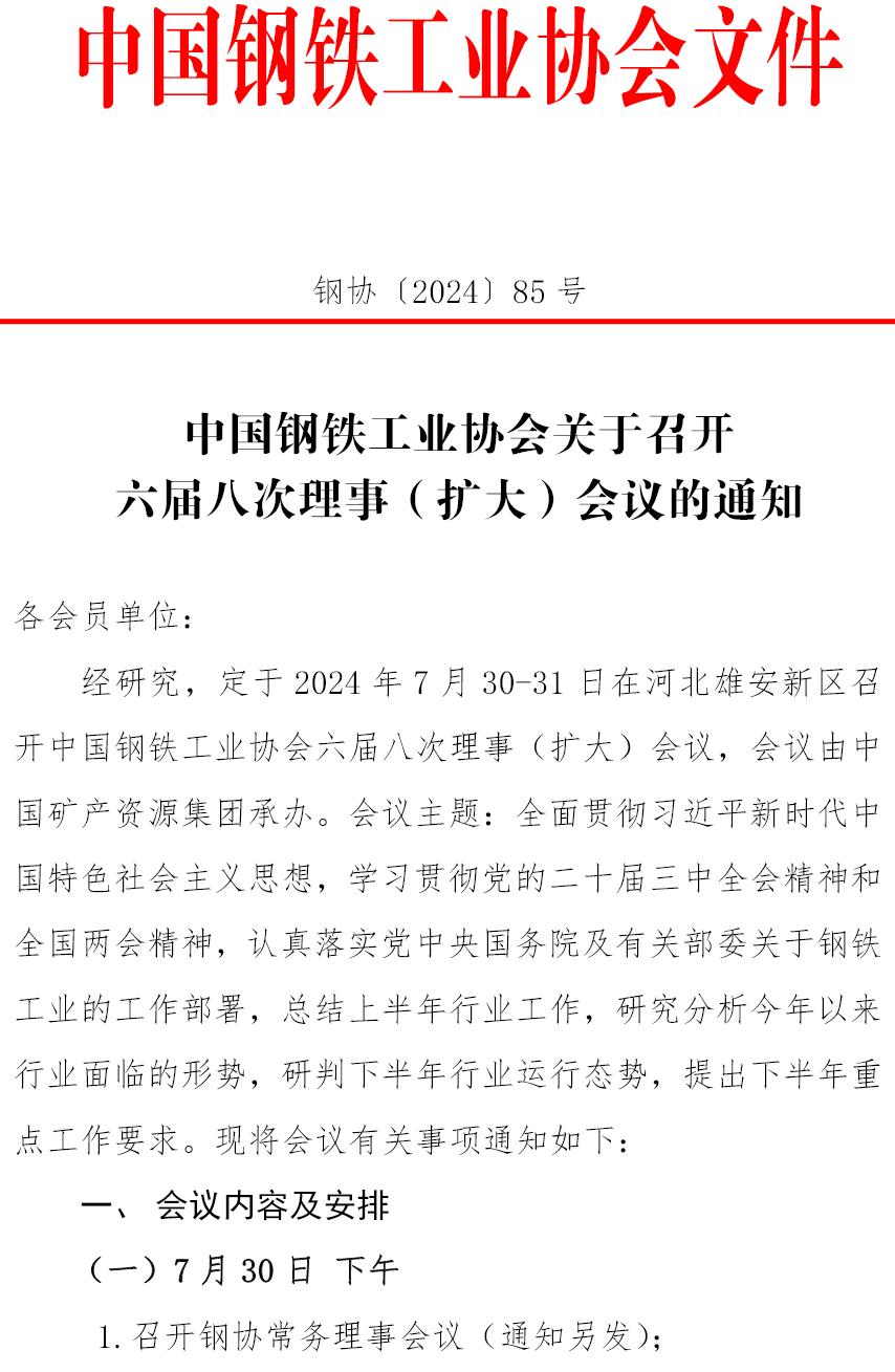 中国钢铁工业协会关于召开六届八次理事(扩大)会议的通知