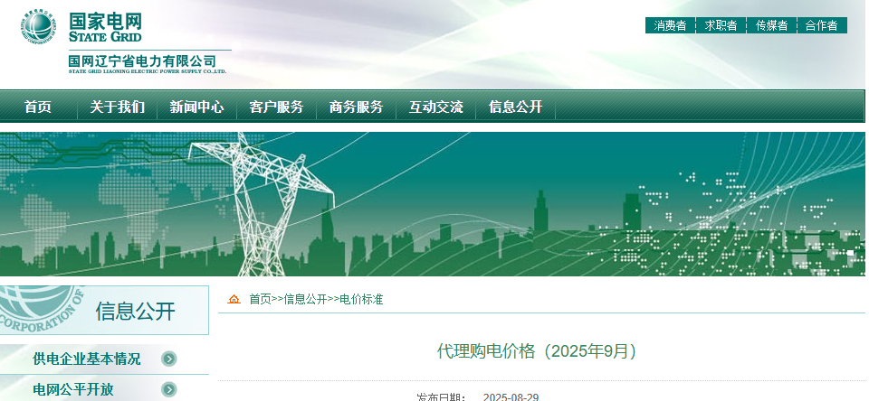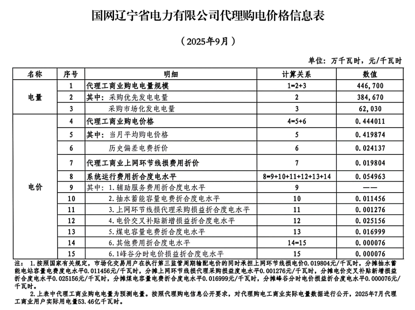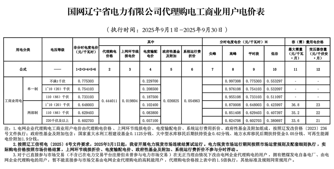 国网辽宁省电力有限公司代理购电工商业用户电价表(2025年9月)