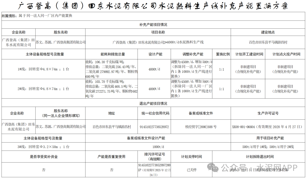 广西登高(集团)田东水泥1#、2#4000t/d生产线各补充产能500t/d,退出产能来自同公司3#1000生产线,置换比例1:1。