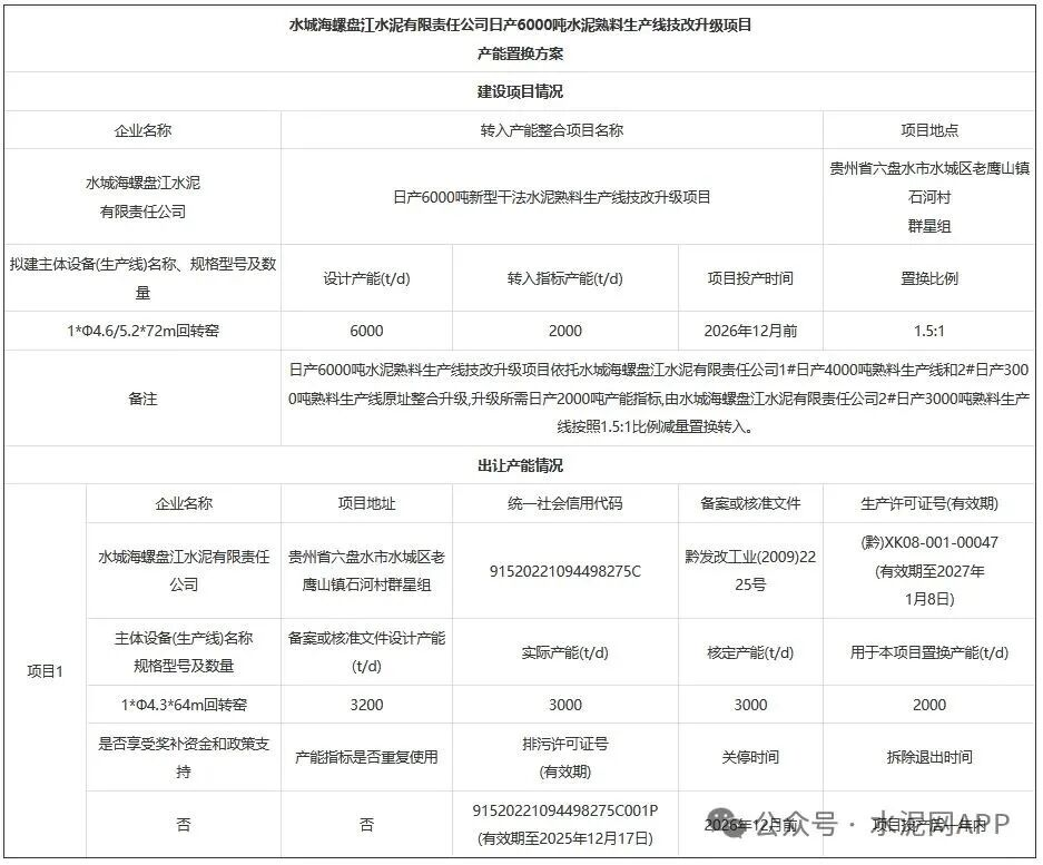 另据此前贵州工信厅发布,水城海螺盘江水泥6000t/d技改升级项目产能置换方案如下: