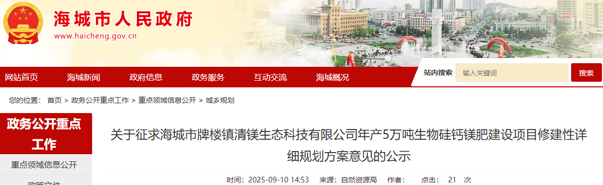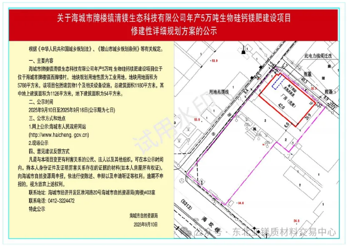 为切实增强规划的科学性、合理性和可行性,征求公众意见,根据《中华人民共和国城乡规划法》第二十六条规定,现将海城市牌楼镇清镁生态科技有限公司年产5万吨生物硅钙镁肥建设项目修建性详细规划方案内容公告如下: