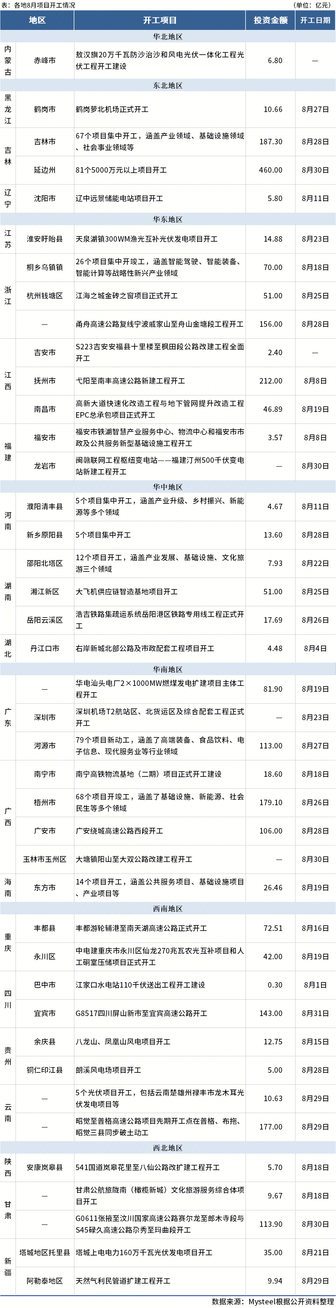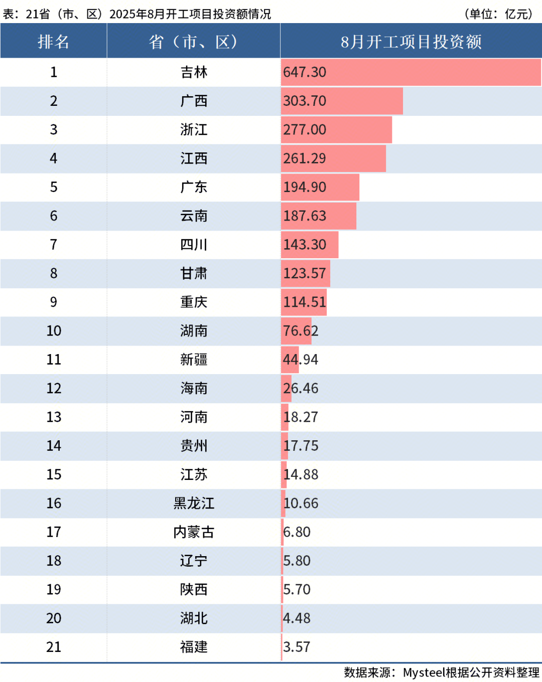 资料显示,8月,开工投资排名前三的省份为吉林、广西、浙江,总投资分别为647.3亿元、303.7亿元、277.0亿元。