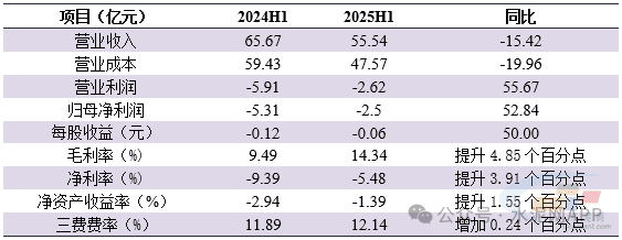 其他指标方面,上半年综合毛利率录得14.34%,比去年同期提升4.85个百分点;尽管净资产收益率仍为负值,但较去年同期明显好转,达到-1.39%。由于营业收入降幅较大,公司三费费率小幅增加0.24个百分点至12.14%。
