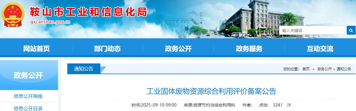按照工信部《工业固体废物资源综合利用评价管理暂行办法》、《国家工业固体废物资源综合利用产品目录》、省工信厅《辽宁省工业和信息化厅关于做好工业固体废物资源综合利用评价工作的通知》(辽工信资源〔2023〕129号)及《鞍山市工业固体废物资源综合利用评价管理实施办法》要求,2025年9月3日-2025年9月9日,我局对鞍山厦美环保科技有限公司、鞍山昊通新材料有限公司、鞍钢绿色资源科技有限公司工业固体废物综合利用评价进行备案公示。截至公示期结束,未收到不同意见,现予以公布。