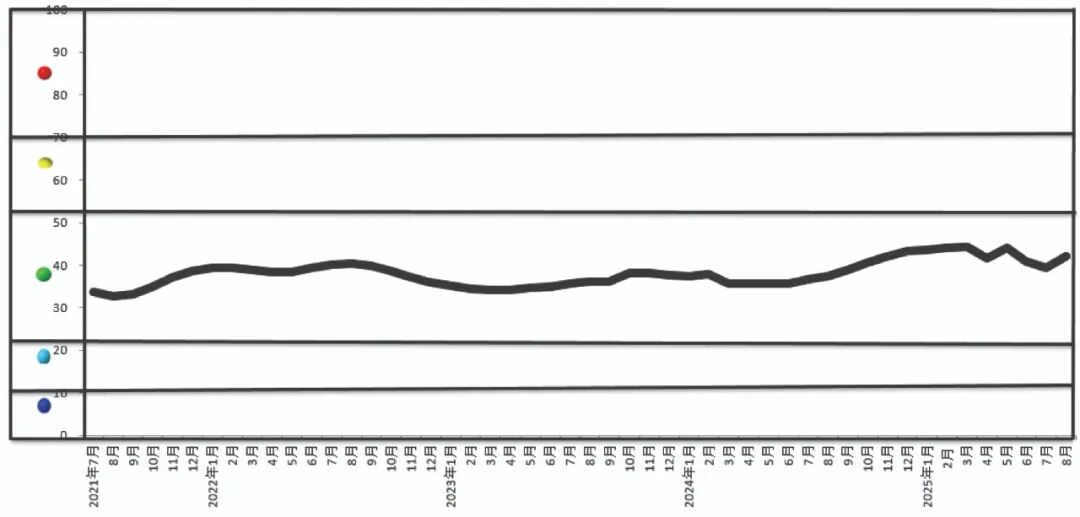 8月份,中国铜产业月度景气指数为42.0,较上月上升2.7个百分点,继续保持在 “正常” 区间运行。中国铜产业月度景气指数变化趋势如图1所示。