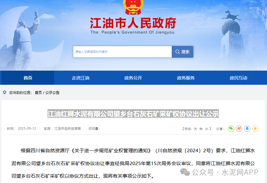 9月12日,四川省江油市人民政府发布“江油红狮水泥有限公司望乡台石灰石矿采矿权协议出让公示”。