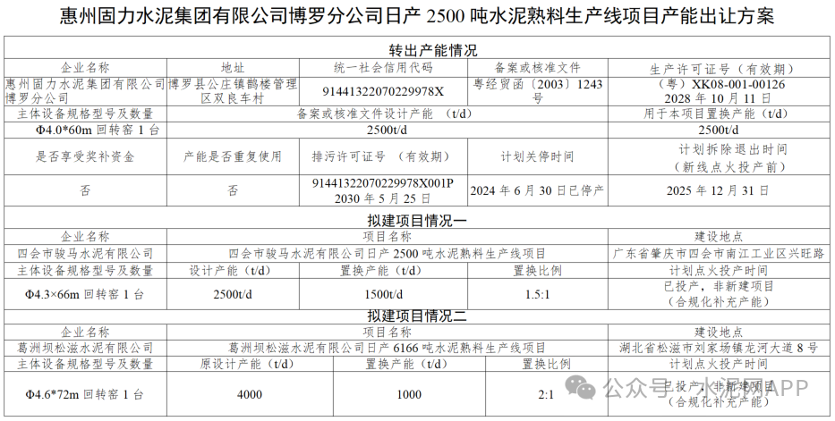 产能置换方案显示,惠州固力水泥集团有限公司博罗分公司转出一条2500t/d熟料产能,其中1500t/d产能用于补充四会市骏马水泥生产线,1000t/d产能用于补充葛洲坝松滋水泥生产线。