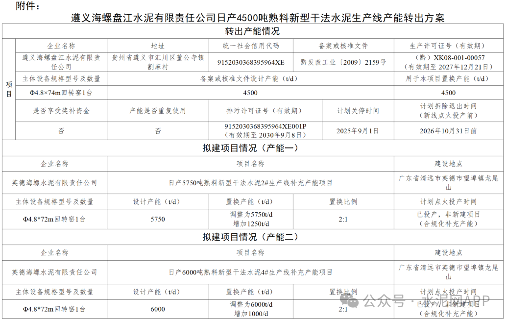 置换方案显示,遵义贵州盘江水泥一条4500t/d生产线产能转出,其中2500t/d产能用于补充英德海螺水泥2#生产线,2000t/d产能补充英德海螺水泥4#生产线,置换比例均为2:1。