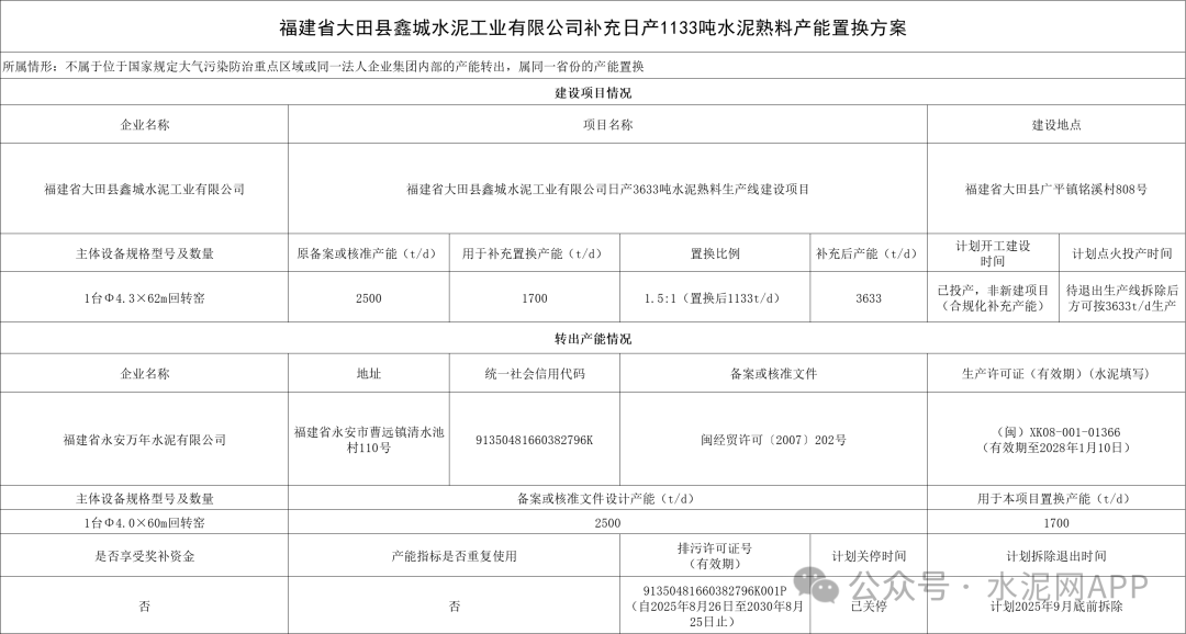 置换方案显示,福建省大田县鑫城水泥2500t/d补充产能1700t/d,补充后产能为3633t/d,退出产能来自福建省永安万年水泥一条2500t/d熟料生产线(用于本项目1700t/d),置换比例1.5:1。