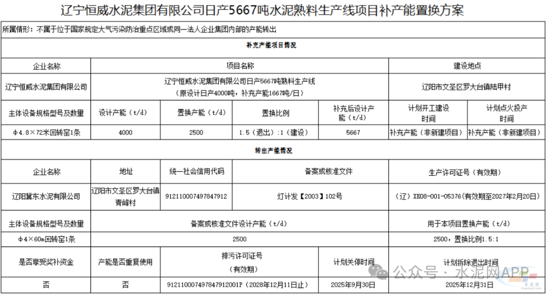 置换方案显示,辽宁恒威水泥4000t/d熟料生产线补充产能1667t/d,补充后产能为5667t/d,退出产能来自辽阳冀东水泥一条2500t/d熟料生产线。