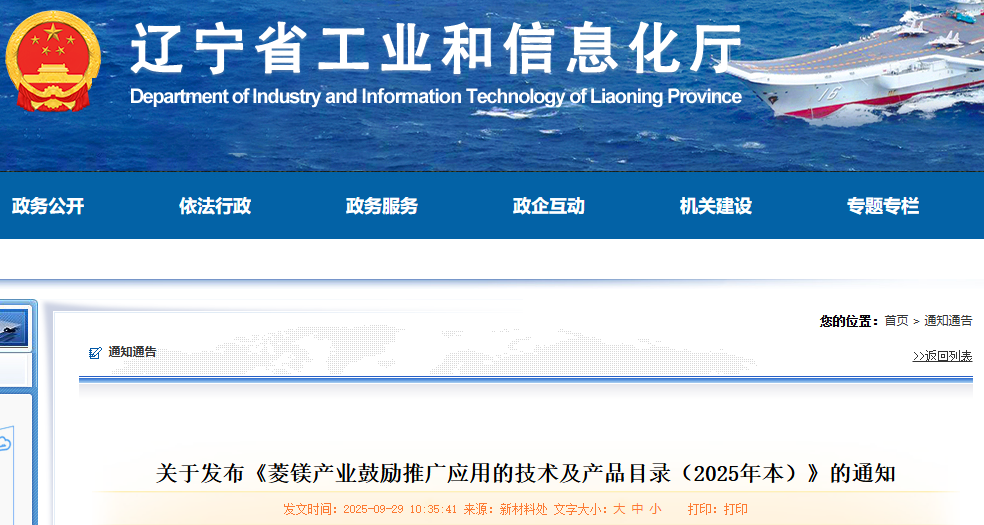 按照《辽宁省人民政府办公厅关于推进菱镁行业高质量发展的实施意见》(辽政办发〔2023〕15号)精神,为持续搭建技术交流平台,推动新技术、新产品成果转化,加快菱镁行业发展形成新质生产力,深入推进行业高质量发展,省工业和信息化厅组织征集已经进入或接近产业化应用阶段的新技术、新产品,经相关专家论证、厅门户网站公示后,编制形成《菱镁产业鼓励推广应用的技术及产品目录(2025年本)》,现予发布。请做好目录的推广应用和指导。