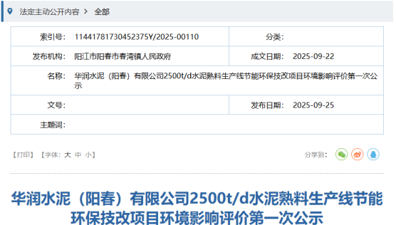 近日,广东省阳江市阳春市春湾镇人民政府网站发布了华润水泥(阳春)有限公司2500t/d水泥熟料生产线节能环保技改项目环境影响评价第一次公示。