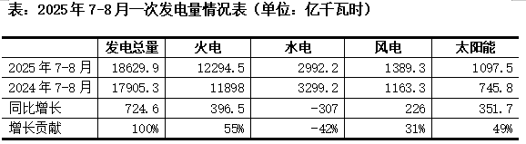 ★新能源替代效应大为增强七、八月份,与火电装机容量基本相当的新能源出力正当时,风电、太阳能发电等新能源装机的新增发电量不仅弥补了水电下降带来的供应缺口,还在很大程度上满足了全社会用电量增长的需求(同比增长3.7%)。这从国家统计局发布的一次发电量情况表中可以清楚的看出来。