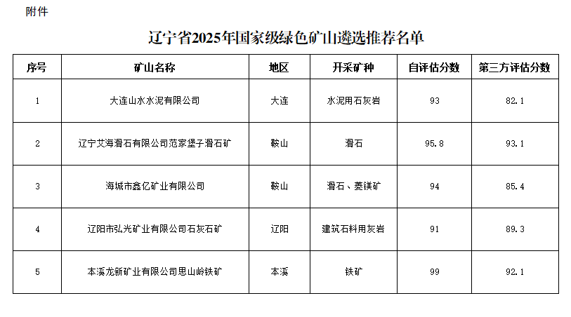 按照《关于进一步加强绿色矿山建设的通知》(自然资规〔2024〕1号)和《自然资源部办公厅关于开展新一批国家级绿色矿山遴选工作的通知》(自然资办发〔2025〕8号)相关要求,辽宁省自然资源厅严格组织开展国家级绿色矿山遴选推荐工作。经企业自主申报、省厅综合评审,现择优确定5家企业作为2025年国家级绿色矿山遴选推荐对象,具体名单详见附件。