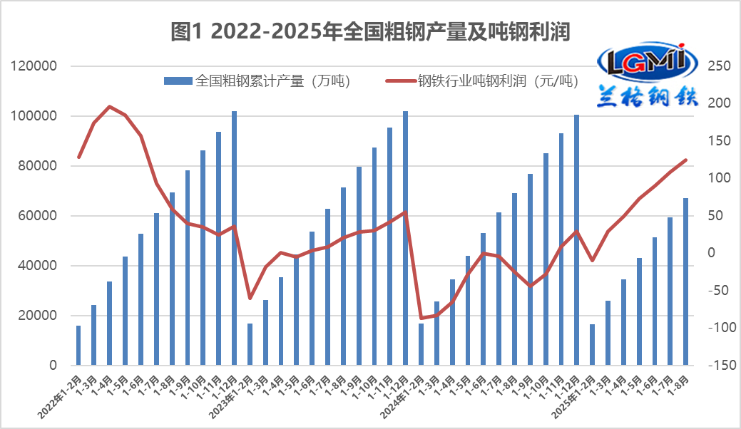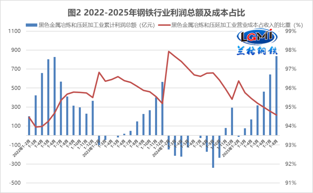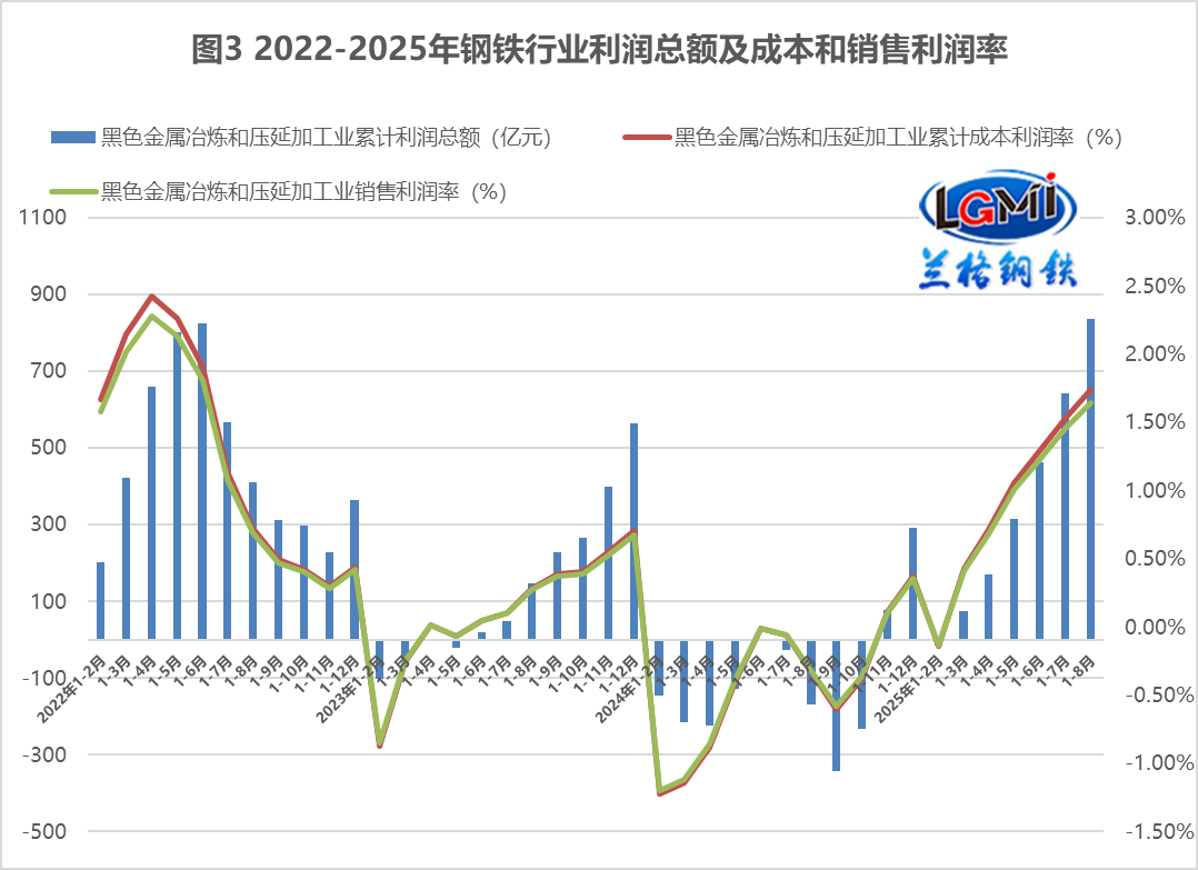 8月份,在经济运行稳中有进、限产政策逐步落实、淡季效应持续突显、成本支撑维持韧性的影响下,国内钢铁市场呈现了震荡走弱的行情,但由于原料成本持续下降,使得钢铁行业的盈利空间持续扩大。根据国家统计局发布数据显示,2025年1-7月黑色金属冶炼和压延加工业盈利643.6亿元,同比增长5175.4%。从月度数据来看,1-2月钢铁行业亏损15.5亿元,3月份钢铁行业盈利90.6亿元,4月份钢铁行业盈利94.1亿元,5月份钢铁行业盈利147.7亿元,6月份钢铁行业盈利145.9亿元,7月份钢铁行业盈利180.8亿元,8月份钢铁行业盈利193.4亿元,环比增加12.6亿元。
