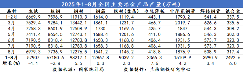 2025年1-8月,全国生铁、粗钢产量同比下降,但钢材产量同比上升。据国家统计局数据显示, 1-8月,我国粗钢产量6.72亿吨,同比下降2.8%,累计日产276.47万吨;生铁产量5.79亿吨、同比下降1.1%,累计日产238.30万吨;钢材产量9.82亿吨、同比增长5.5%,累计日产404.19万吨。其中重点统计钢铁企业共生产粗钢5.55亿吨,同比下降0.9%,累计粗钢日产228.52万吨;生产生铁4.98亿吨,同比下降0.3%,生铁累计日产205.05万吨;生产钢材5.62亿吨,同比增长2.3%,钢材累计日产231.31万吨。从各品种细分产量数据来看,1-8月钢材细分品类产量从同比分化转向了同向增长;其中建筑钢材品种中的钢筋和线材产量同比由降转增,板材品种产量均同比明显增长;管材和铁合金品种产量同比也有所增长(详见表1)。