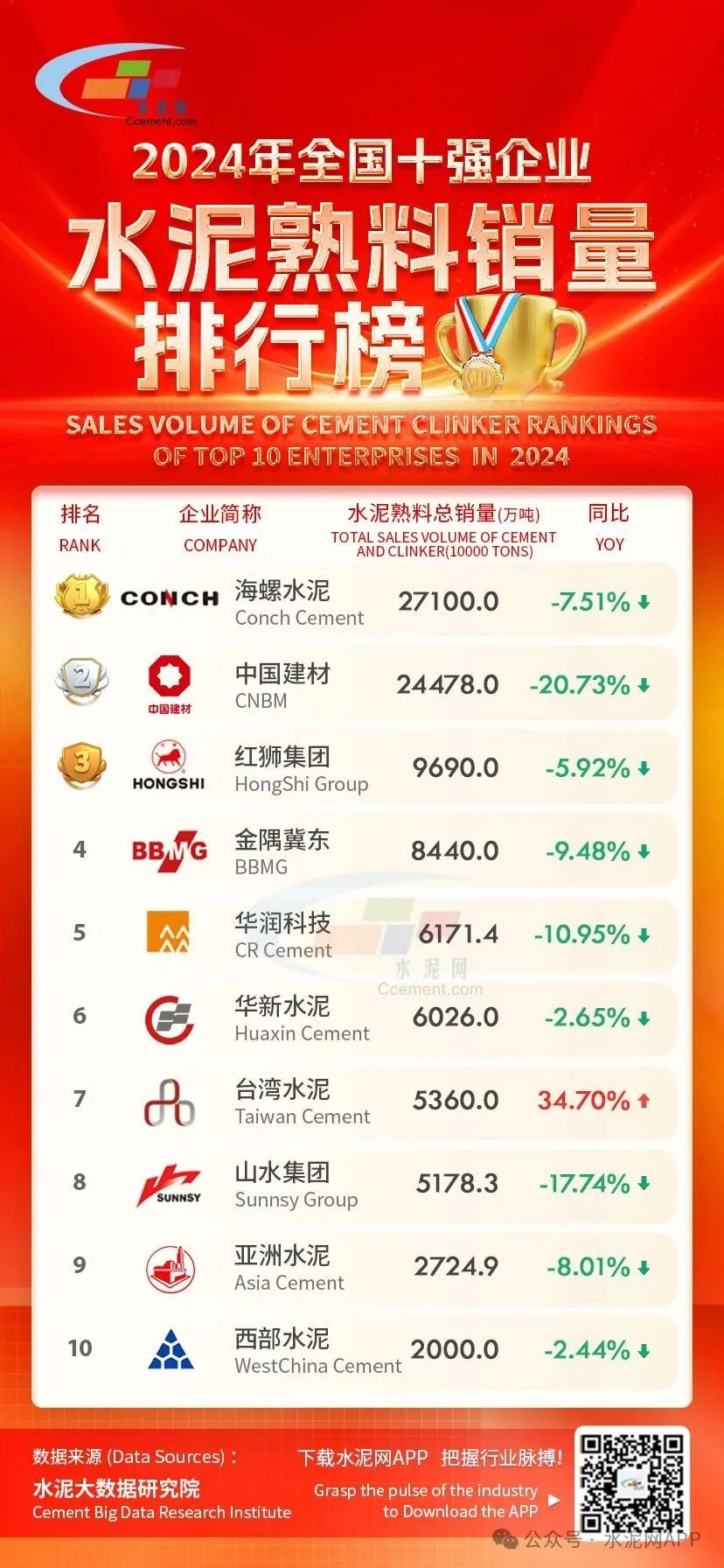近日,中国水泥网发布2024年中国水泥熟料总销量TOP10排行榜。从排名来看,2024年海螺水泥熟料总销量27100万吨,超越中国建材位居榜首,华新水泥、台湾水泥均超过山水水泥,分别提升至第六位、第七位,山水水泥则下降至第八位,西部水泥进入前十位。从销量变化来看,仅有一家企业销量出现增长,九家出现下降。2024年,台湾水泥度完成土耳其、葡萄牙相关资产收购后,水泥熟料同比销量大增34.7%;深度参与海外市场的华新水泥、西部水泥明显跑赢国内大盘,降幅较小,分别为2.65%、2.44%;中国建材、山水水泥降幅较大,特别是中国建材,水泥熟料销量较同期下降近21%,山水水泥超过17%;华润建材科技降幅在11%左右,金隅冀东、亚洲水泥、海螺水泥、红狮控股集团均低于10%,降幅分别为9.48%、8.01%、7.51%、5.92%。(注:水泥企业水泥熟料销量是水泥销量和熟料外销量之和(不含自用熟料),既包括企业在国内的销量也包括在海外的销量;天瑞水泥暂未披露2024年度年报,不参与此次排名)