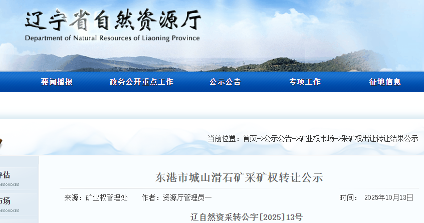 根据《探矿权采矿权转让管理办法》(国务院令242号)、《自然资源部关于印发矿业权出让交易规则的通知》(自然资规〔2023〕1号)等相关规定,现将东港市城山滑石矿采矿权转让信息公示如下: