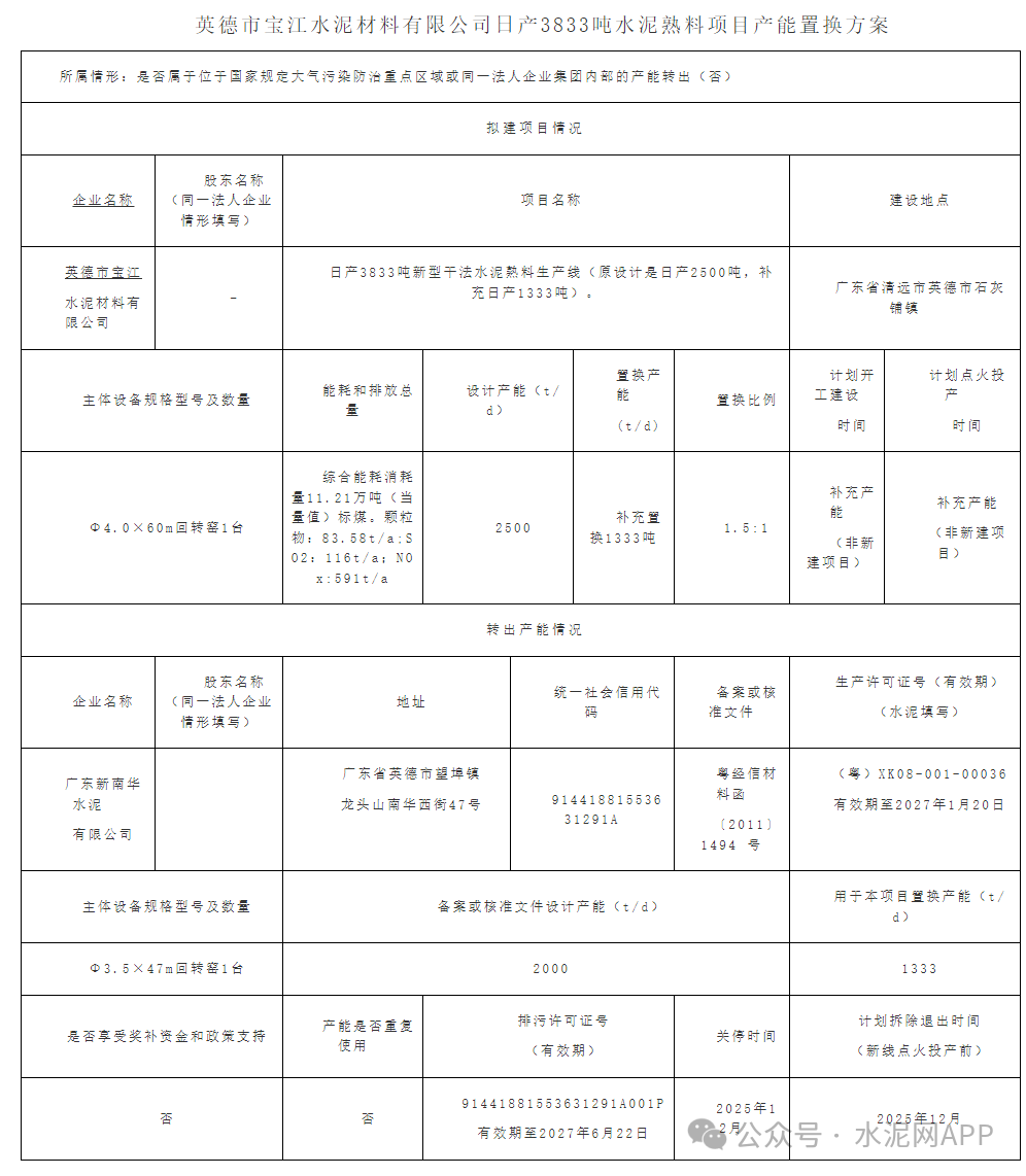 置换方案显示,英德市宝江水泥2500t/d生产线补充产能1333t/d,补充后产能达3833t/d,退出产能来自广东新南华水泥有限公司一条2000t/d生产线,置换比例1.5:1。