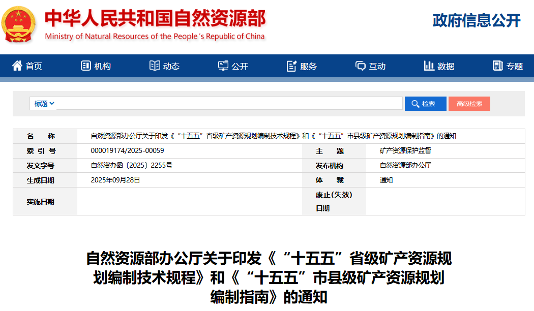 为加强部省衔接,指导做好省市县各级矿产资源规划工作,依据《矿产资源法》和《矿产资源规划编制实施办法》,按照《自然资源部办公厅关于开展“十四五”矿产资源规划总结评估及“十五五”规划编制工作的通知》(自然资办发〔2025〕19号)要求,部研究制定了《“十五五”省级矿产资源规划编制技术规程》和《“十五五”市县级矿产资源规划编制指南》,现印发给你们,请参照执行。