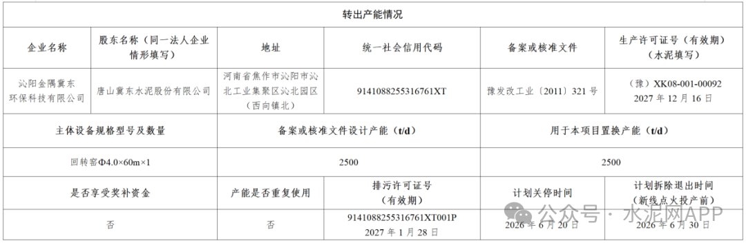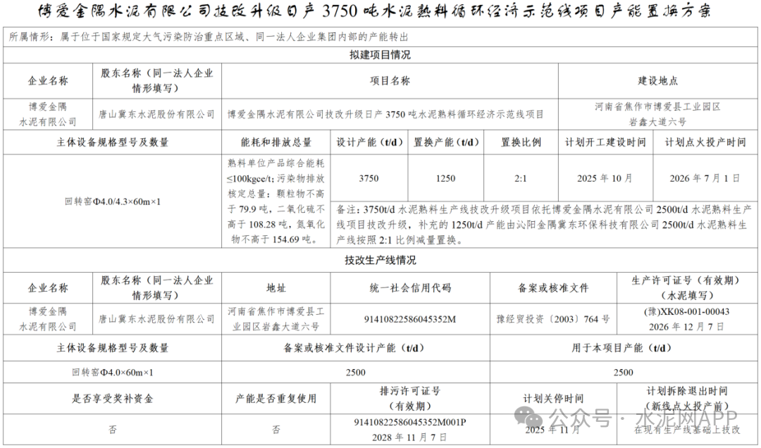 置换方案显示,博爱金隅3750t/d水泥熟料生产线技改升级项目依托博爱金隅水泥有限公司2500t/d水泥熟料生产线项目技改升级,补充的1250t/d产能由沁阳金隅冀东环保科技有限公司2500t/d水泥熟料生产线按照2:1比例减量置换。