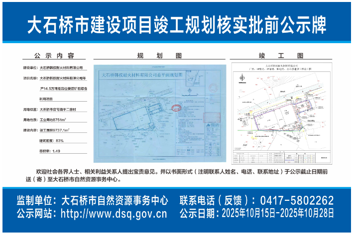 大石桥韩权耐火材料有限公司年产14.5万吨低品位菱镁矿石综合利用建设项目,核发《建设工程规划核实通知书》批前公示