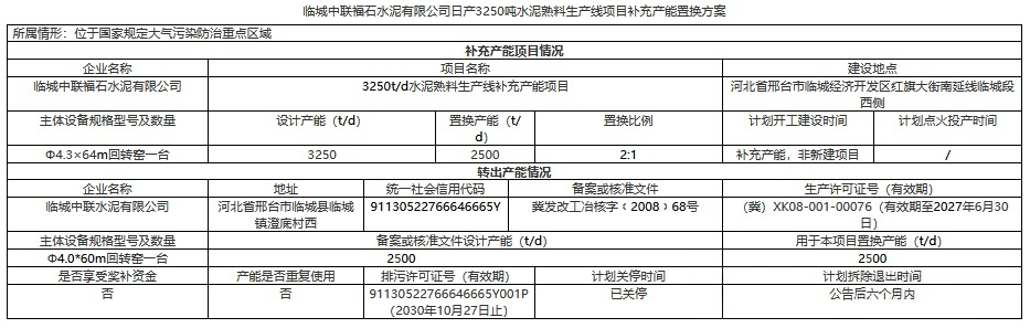 10月27日,河北省工信厅发布“关于临城中联福石水泥有限公司日产3250吨水泥熟料生产线项目补充产能置换方案的公示”。