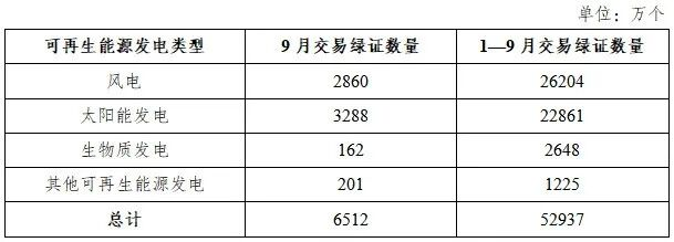 2025年9月,全国交易绿证6512万个,其中绿色电力交易绿证2102万个。2025年1—9月,全国交易绿证5.29亿个,其中绿色电力交易绿证1.79亿个。