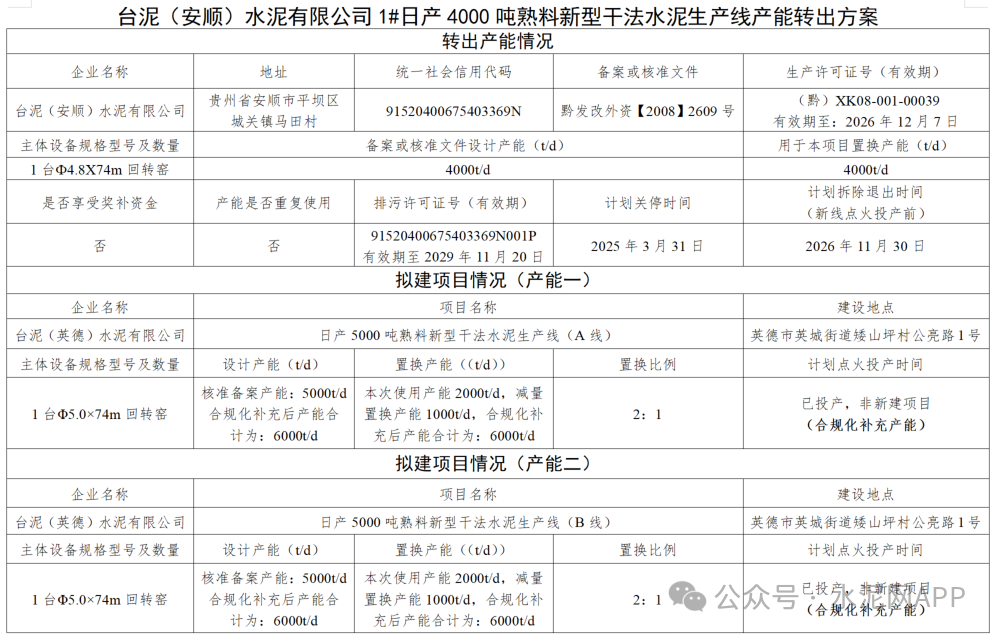 置换方案显示,台泥(安顺)转出一条4000t/d熟料生产线产能,分别用于补充台泥(英德)两条5000t/d熟料生产线,补充完成后,生产线产能为6000t/d,置换比例2:1。