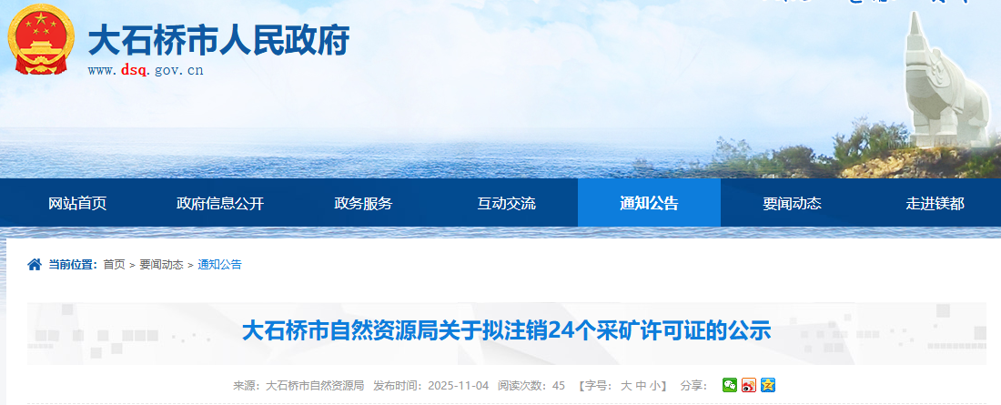 大石桥市南楼经济开发区工农兴旺建筑石矿等24个采矿许可证,矿业权人在有效期届满前未按规定申请办理延续登记,采矿许可证已自行废止。根据《矿产资源开采登记管理办法》(国务院令第241号)和《自然资源部关于进一步完善矿产资源勘查开采登记管理的通知》(自然资规[2023]4号)第十八条,大石桥市自然资源局拟对上述采矿许可证予以注销,现进行公示。