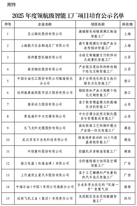 根据《关于开展2025年度智能工厂梯度培育行动的通知》(工信厅联通装函〔2025〕251号),现将拟入选的2025年度领航级智能工厂项目培育名单进行公示,请社会各界监督。如有异议,请在公示期内将书面意见反馈至工业和信息化部装备工业一司(智能制造处)。