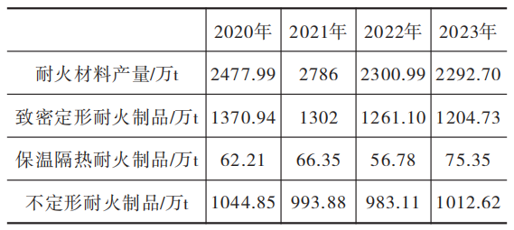 2023年我国耐火材料制品进口量2.25万t,同比减少11.4%;出口量214.71万t,同比减少2.3%;表观消费量2080.24万t,基本与2022年持平,2020—2023年我国耐火材料表观消费量见表2。