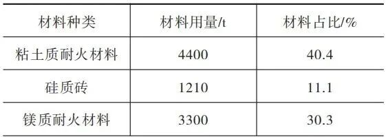 表4 700t/d浮法玻璃熔窑耐火材料配置及用量