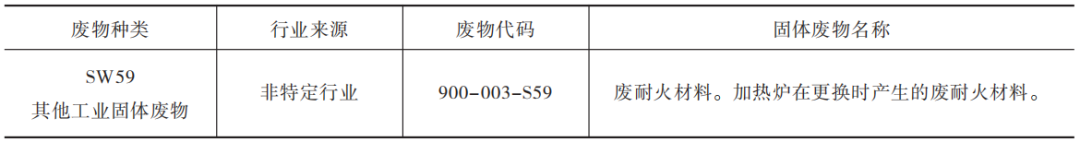 2024年1月19日,生态环境部印发的《固体废物分类与代码目录》(生态环境部公告2024年第4号)提出,废耐火材料被列入非特定行业的其他工业固体废物,见表5。