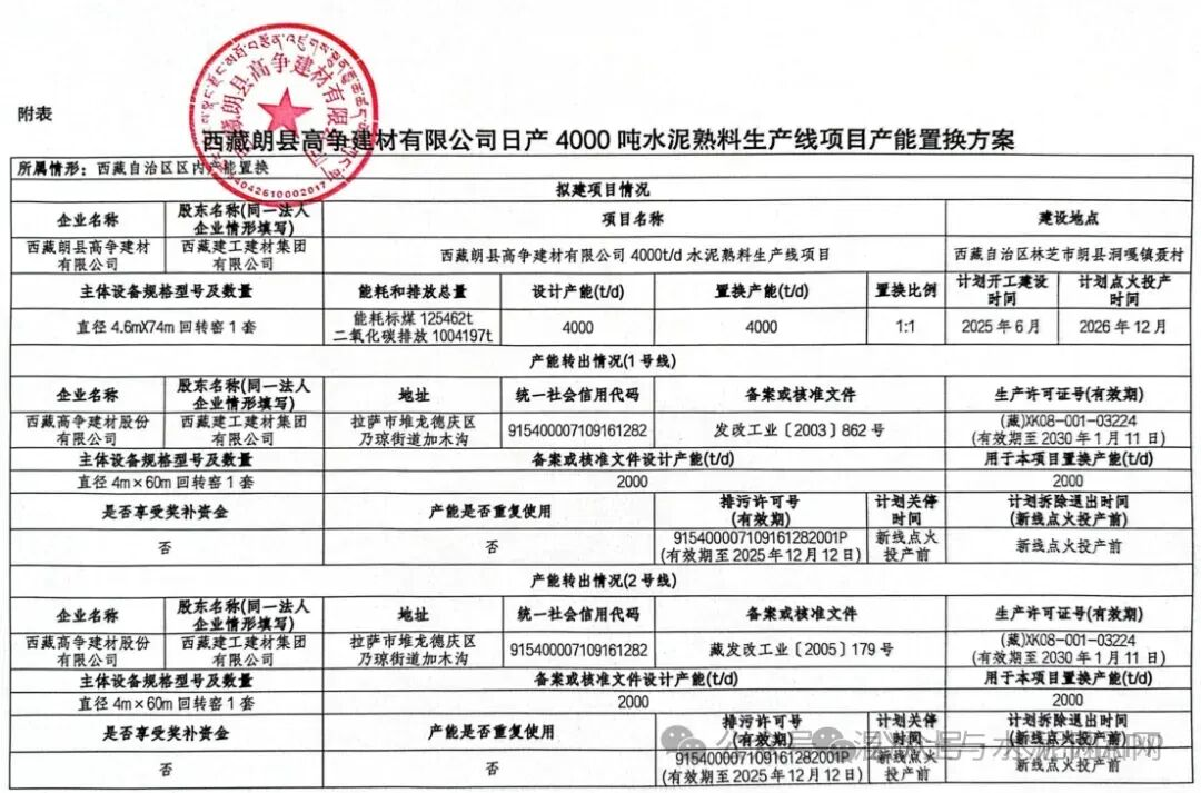 西藏朗县高争建材有限公司将1:1等量置换建设4000t/d水泥熟料生产线项目;建设地点为西藏自治区林芝市朗县洞嘎镇聂村;主体设备型号和数量为直径4.6mX74m回转窑1套;设计产能为4000t/d水泥熟料(年产120万吨水泥熟料);能耗总量为125462t标煤(当量值,不含矿山开采)、二氧化碳排放总量为1004197t,拟建生产线按照能效标杆水平和环保绩效A级水平建设,主要用能设备达到能效先进水平。预计2026年12月点火投产。