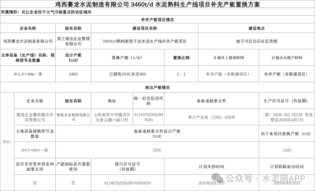 置换方案显示,鸡西赛龙水泥制造有限公司一条2500t/d熟料生产线补充产能960t/d,补充后产能3460t/d,退出产能来自智海企业集团榆次水泥有限公司一条2500t/d熟料线(用于本项目1920t/d),置换比例2:1。