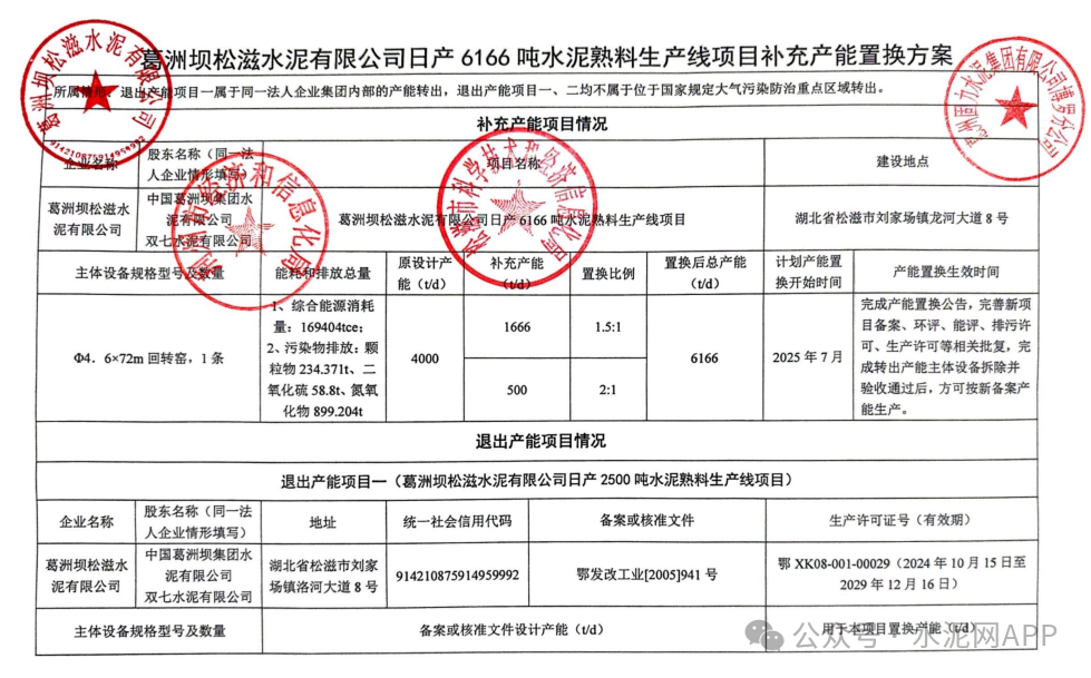 置换方案显示,葛洲坝松滋水泥一条4000t/d熟料生产线补充产能2166t/d,补充后产能6166t/d,退出产能来自同公司一条2500t/d熟料生产线及惠州固力水泥博罗分公司一条2500t/d熟料线(用于本项目1000t/d),前者置换比例1.5:1,后者2:1。