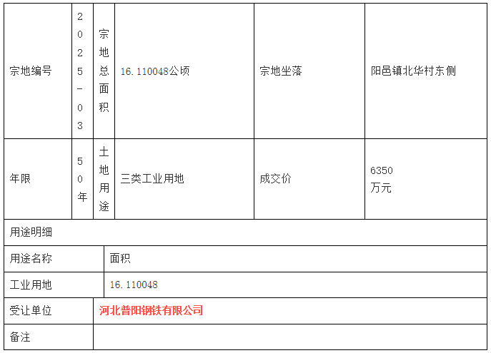 近日,河北普阳钢铁有限公司以6350万元成功竞得武安市阳邑镇北华村东侧一宗工业用地,总面积达16.110048公顷,使用年限50年。该地块通过公开挂牌方式出让,符合《中华人民共和国土地管理法》等相关法规要求。
