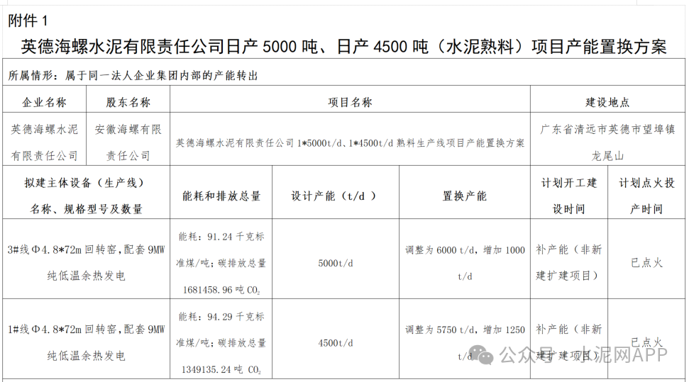 11月14日,广东省工信厅发布“关于英德海螺水泥有限责任公司日产5000吨、日产4500吨(水泥熟料)项目产能置换方案的公示”。