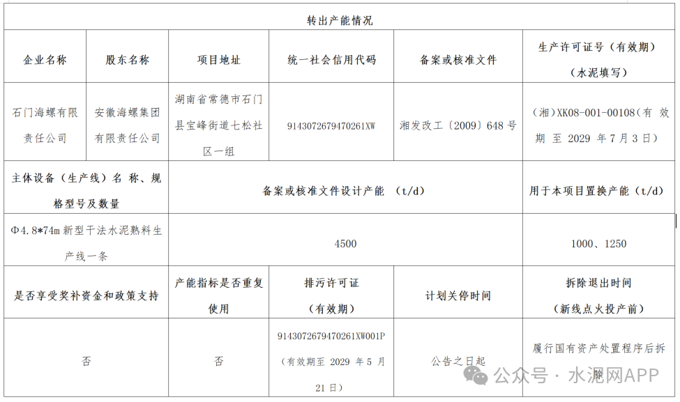 置换方案显示,石门海螺水泥退出一条4500t/d熟料生产线,其中1000t/d产能用于补充英德海螺3#线,补充后产能6000t/d;1250t/d用于1#线,补充后产能5750t/d,置换比例2:1。