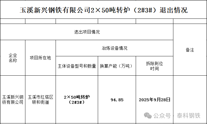 2025年10月23日,玉溪市工业和信息化局发布关于玉溪新兴钢铁有限公司2×50吨转炉(2#3#)退出情况的公示,玉溪新兴钢铁有限公司2×50吨转炉(2#3#)已于2025年9月28日拆除到位,退出。