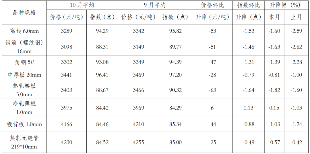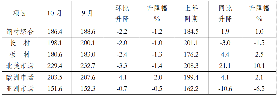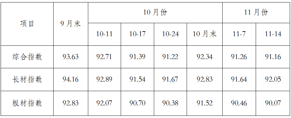 1-10月份,CSPI长材指数平均值为95.12点,同比下降11.10点,降幅为10.45%;板材指数平均值为92.03点,同比下降9.47点,降幅为9.33%。