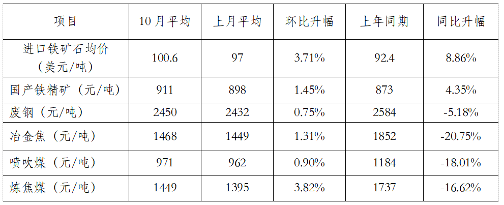 从原燃料来看,与9月相比,主要原燃料各品种平均价格均上升。其中,炼焦煤涨幅较大,为3.82%,废钢涨幅较小,为0.75%,原燃料对钢价的支撑作用有所增强。(见下表)
