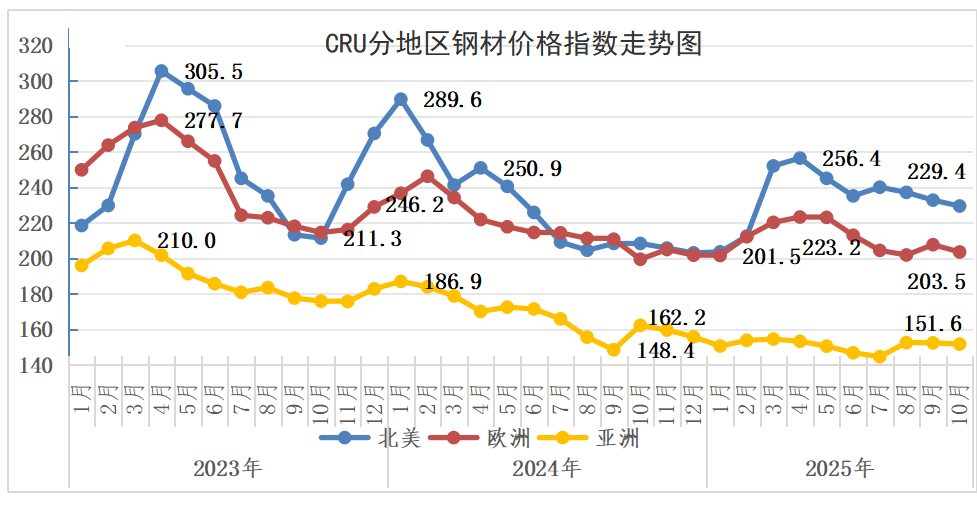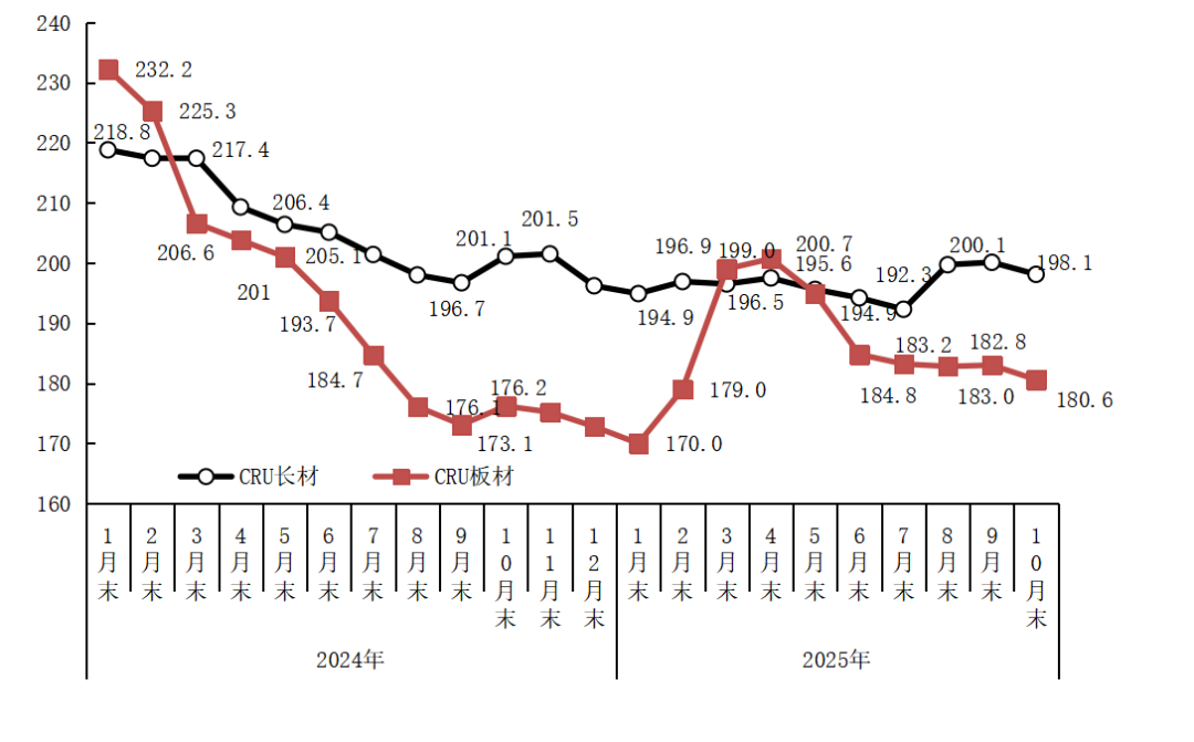 2025年1-10月,CRU国际钢材价格指数平均值为189.4 点,同比下降11.2点,降幅为5.6 %。其中,CRU长材指数平均值为196.6点,同比下降10.6点,降幅为5.1%;CRU板材指数平均值为185.8点,同比下降11.5点,降幅为5.8 %。