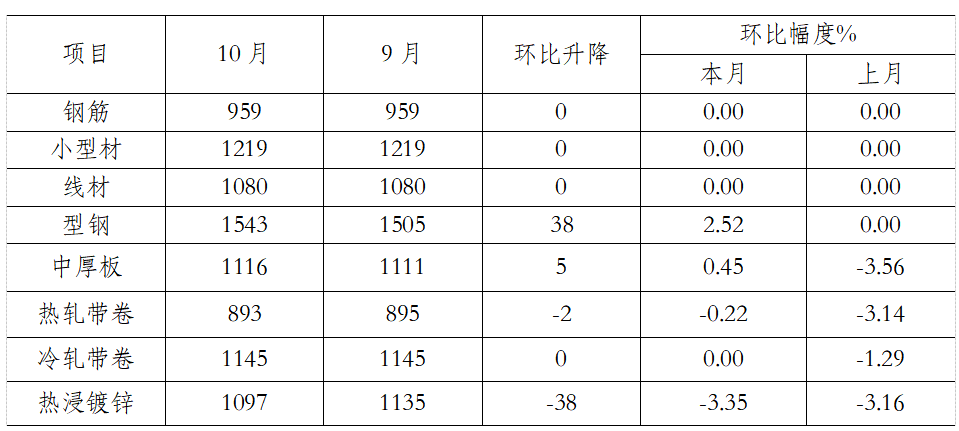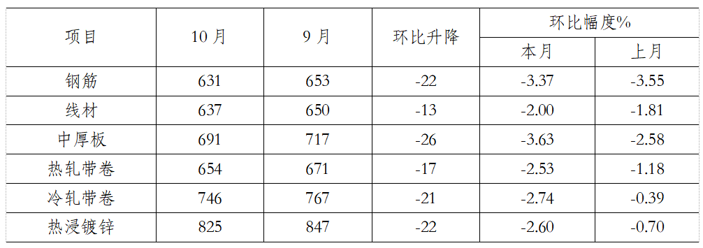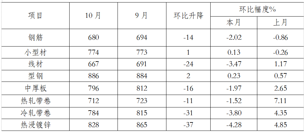 10月份,国内钢材市场震荡下行,月末止跌回升,但整体仍呈震荡下行趋势。进入11月份以来,受淡季效应影响,需求快速下降,钢价回归偏弱的基本面,继续呈现震荡偏弱运行态势。